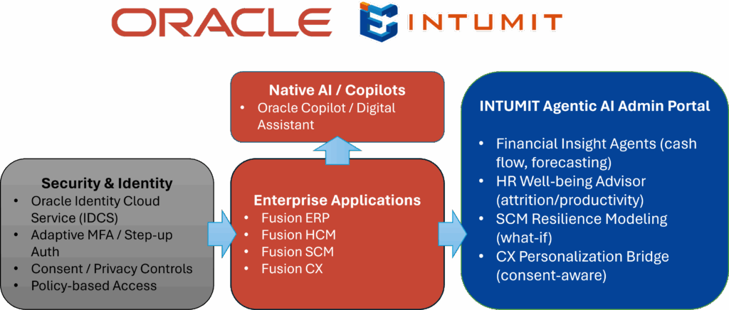 Grâce au portail Agentic AI, les validations financières dans Oracle Fusion ERP sont protégées par une MFA adaptative, garantissant une exécution uniquement autorisée. INTUMIT peut générer des rapports narratifs pour l’EPM, expliquer les contenus avec des liens de référence et rédiger des synthèses d’achats, apportant ainsi davantage de valeur à vos solutions d’IA d’entreprise et d’IA industrielle.