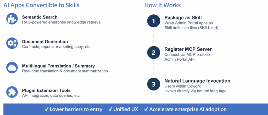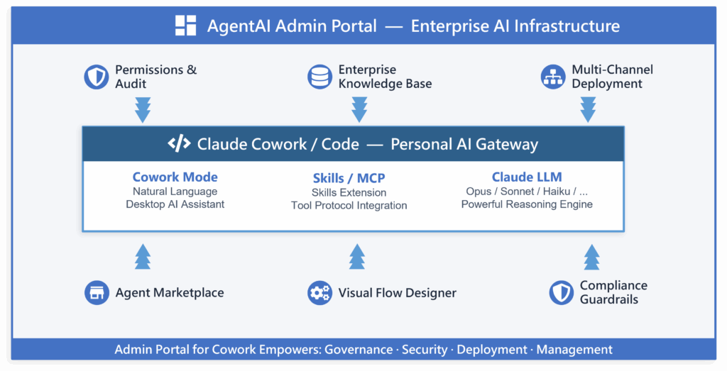 Claude + INTUMIT gèrent des agents autonomes en exploitant les données issues des ERP, CRM et bases de connaissances, déclenchent des workflows et exécutent des tâches multi-étapes sans intervention manuelle. Cowork sert de passerelle, tandis que le portail AIAgent Admin fournit la base d’entreprise.
